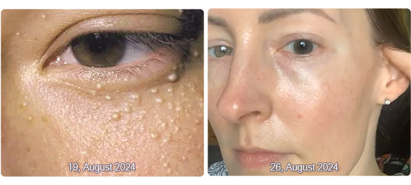 Tap—don’t rub—the cream under your eyes, over crow’s feet, and on the eyelid if needed. Focus on areas with dark circles, puffiness, or fine lines.